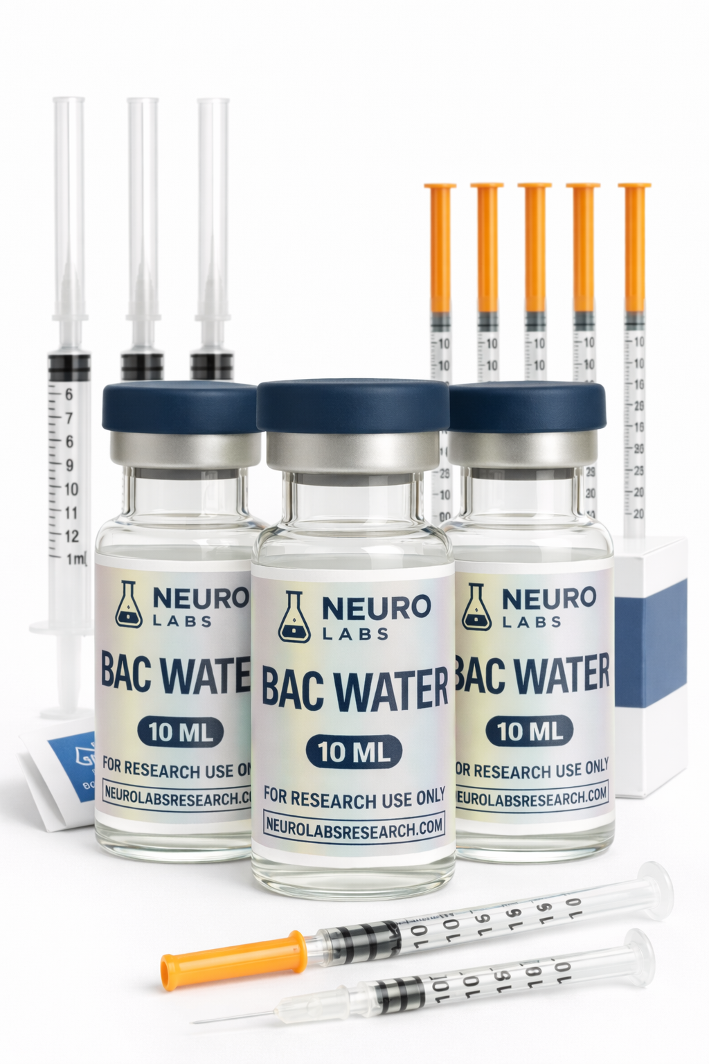 Includes basic supplies needed to begin testing including 30mL BAC water and 2 months supply of anti-bacterial wipes & reconstitution/pin sticks.
